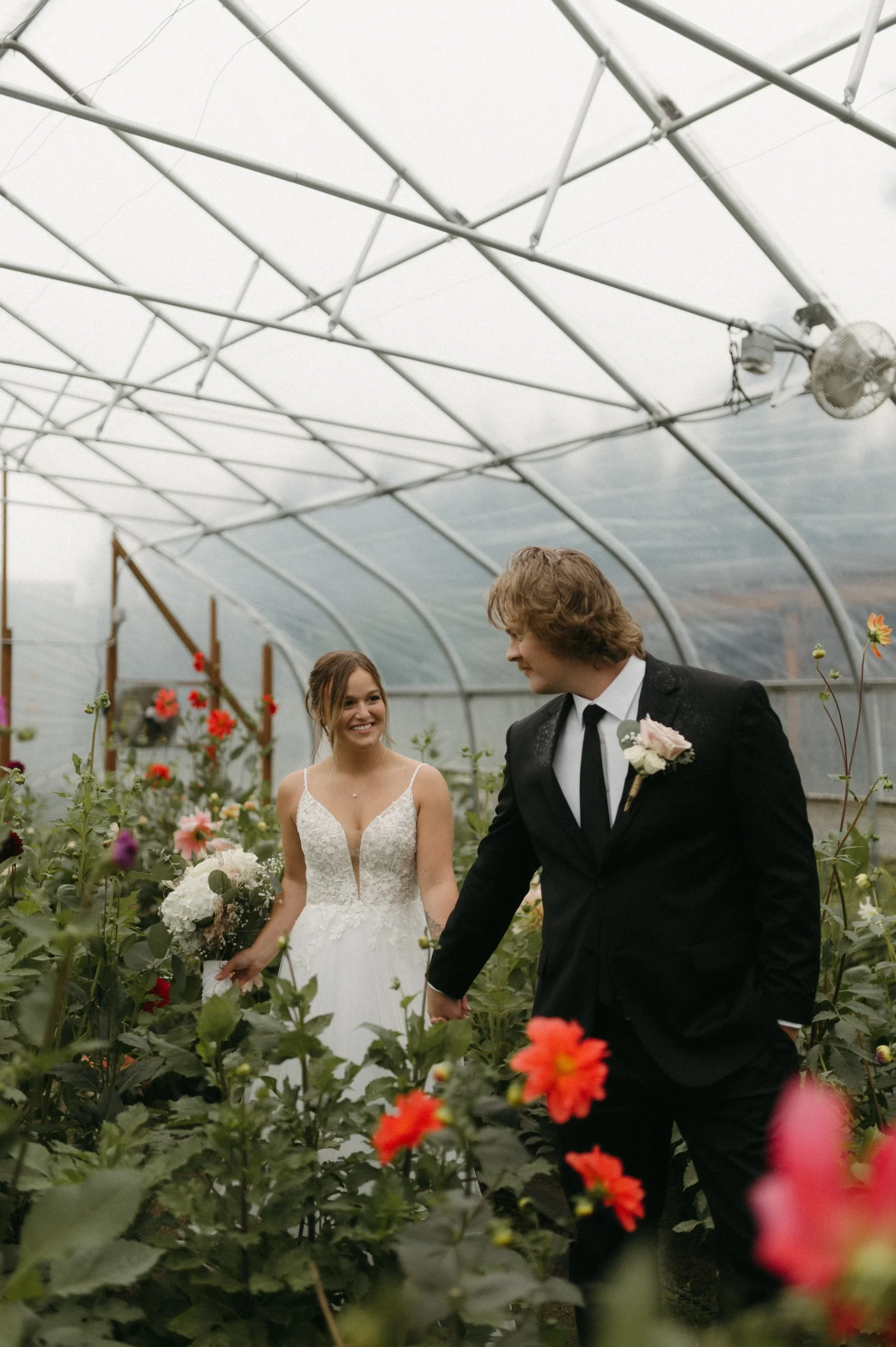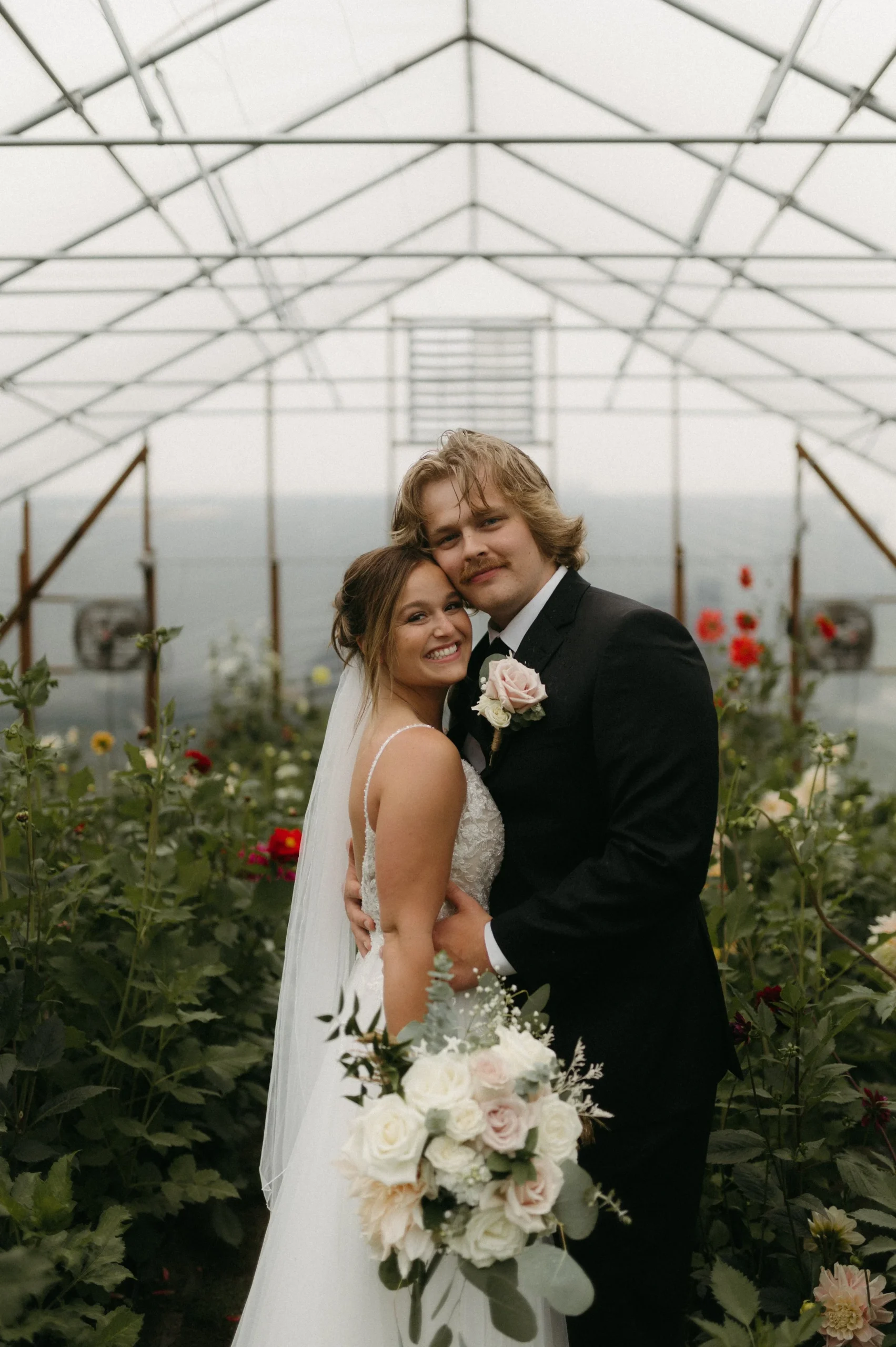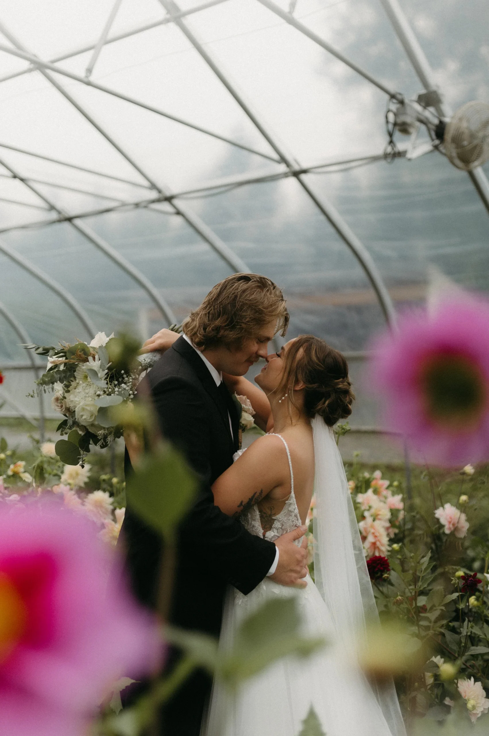 Man oh man, Delaney and Pasha’s rainy wedding day in Palmer, Alaska was WILD! The weather was absolutely stormy, making the entire day an unpredictable adventure. I have never seen such awful weather in my life! Despite the chaos, Delaney and Pasha were able to have a fun and dreamy wedding at Mountain Field Farm. This venue had a renovated colonial homesteading barn with a gorgeous interior, greenhouses with colorful flowers, and beautiful green fields. Overall, Delaney and Pasha were such troopers through it all. They focused solely on the love they share and the memories of becoming one.