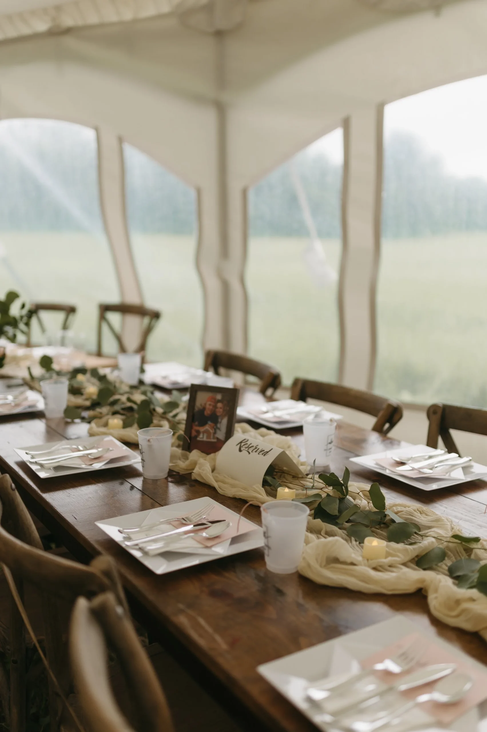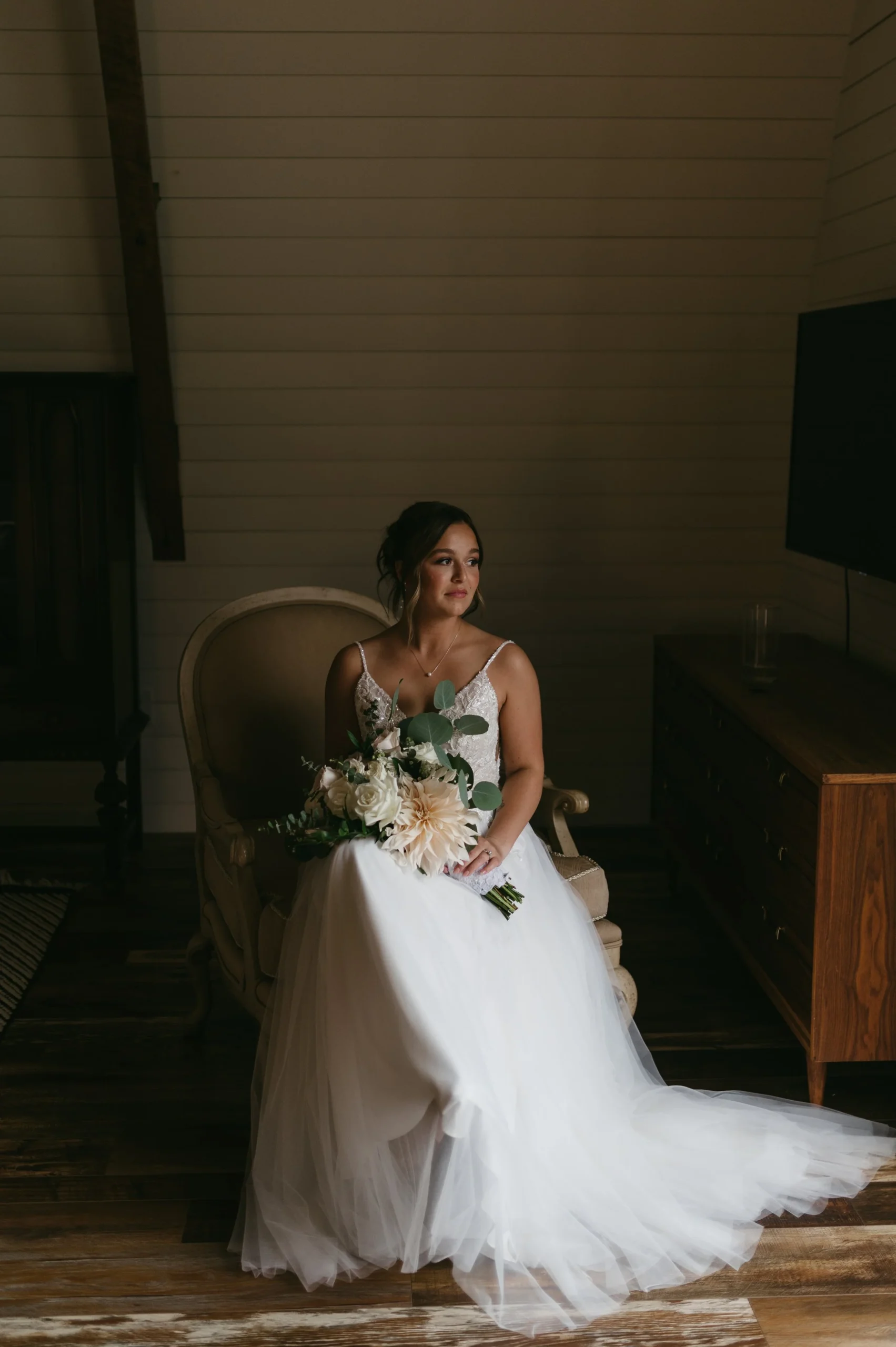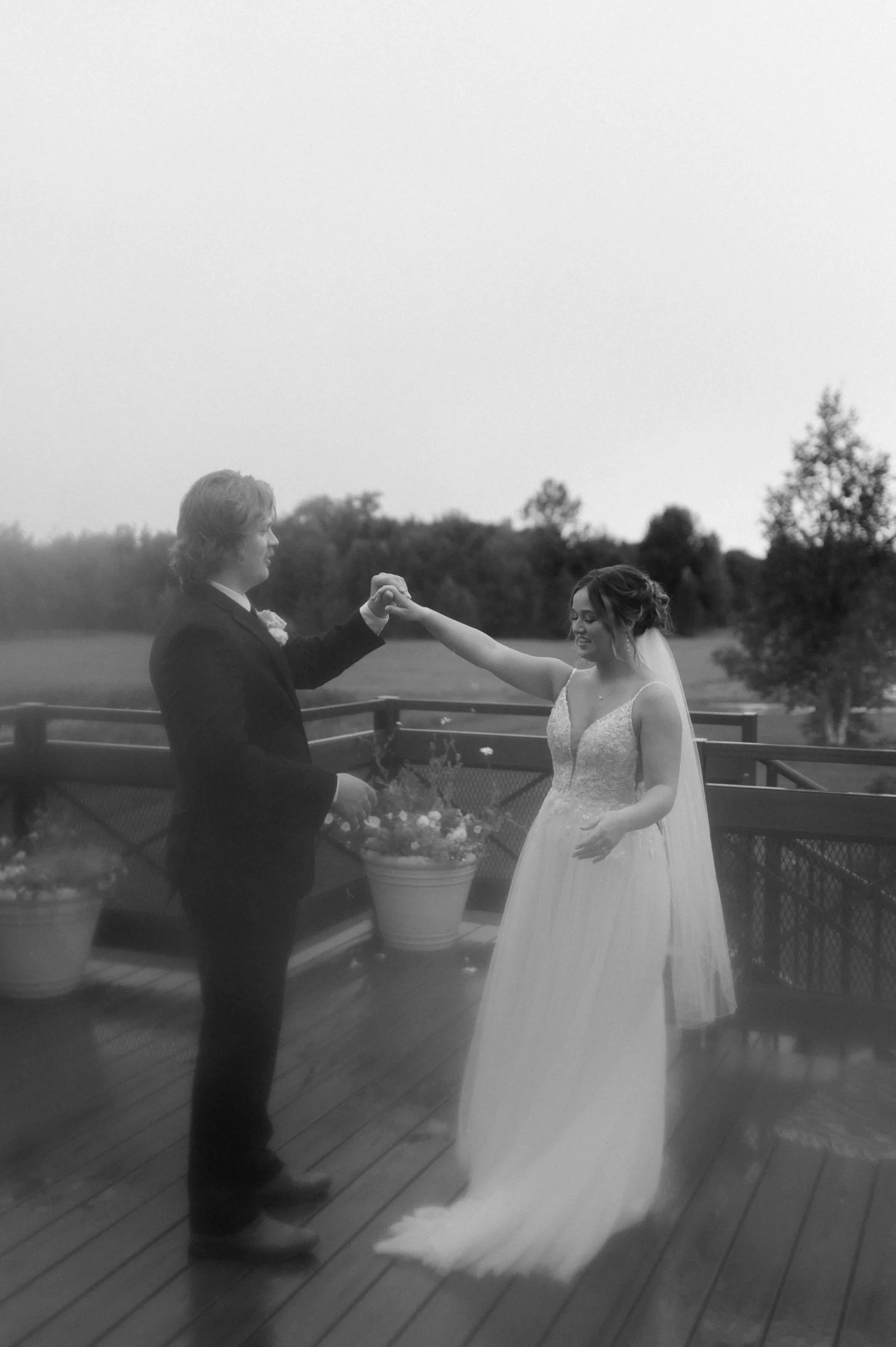 Delaney and Pasha’s wedding started off in a full-blown monsoon! There was torrential downpour and hurricane winds. Having wind or rain is one thing, but the combination of both was terrible! Nevertheless, we made the best of it by capturing photos in the stunning barn while we waited for the weather to let up a little bit. We kept watch on the radar and pushed things back 20 minutes here or there since the storm was supposed to subside. However, every time we thought the weather improved, we would go outside and it would get ten times worse! We ended up pivoting to photographing portraits in the greenhouses and documenting the ceremony in a tent. Right after the ceremony, the weather luckily cleared and we frolicked in the gorgeous fields. All in all, Delaney and Pasha’s rainy wedding day turned out beautiful.