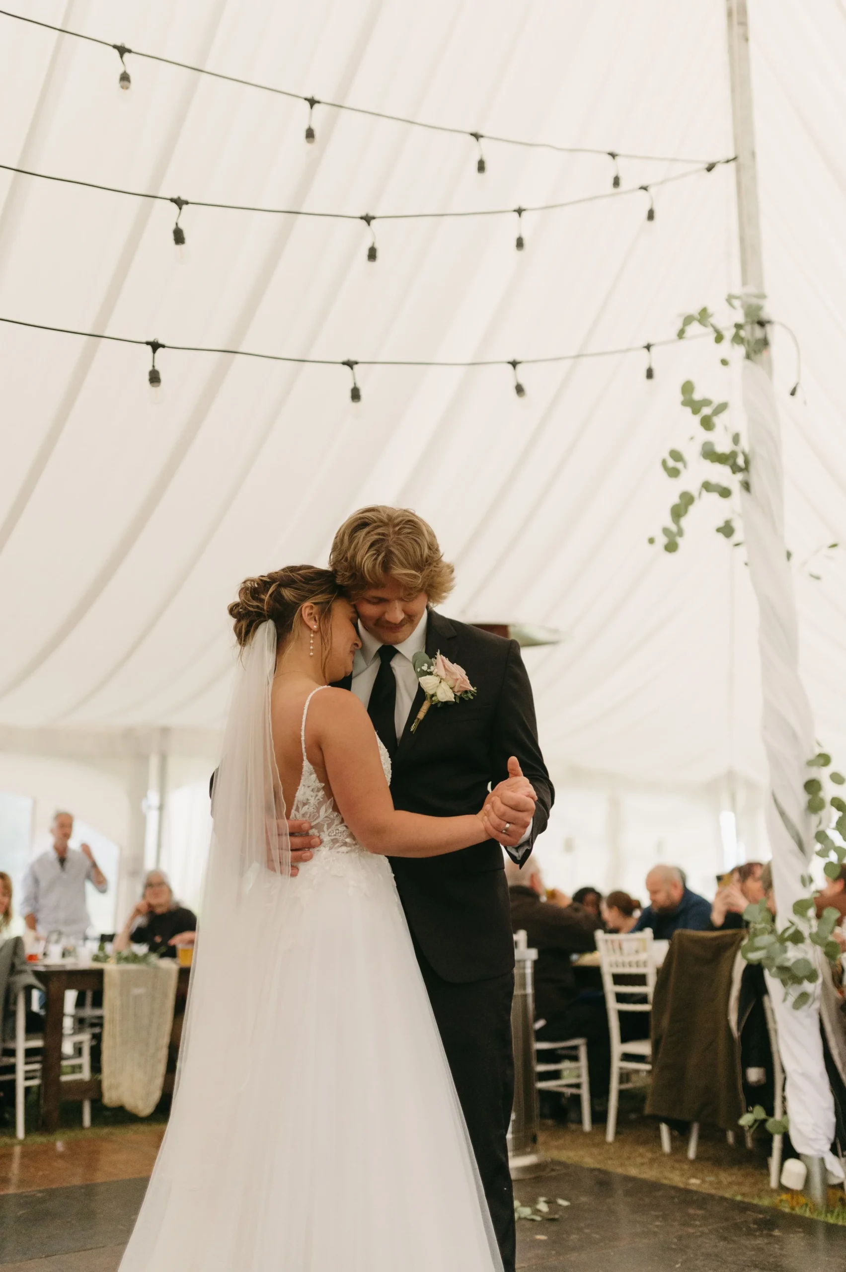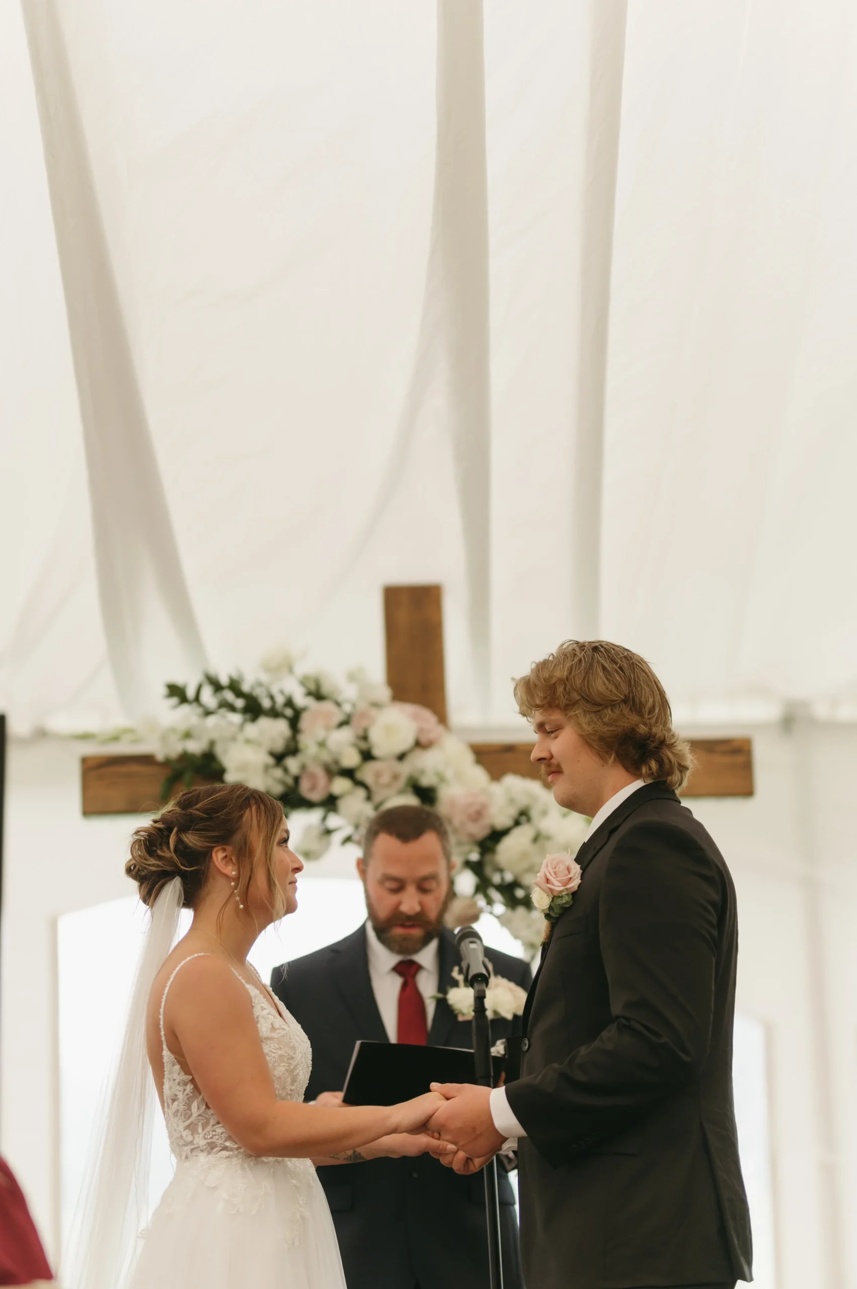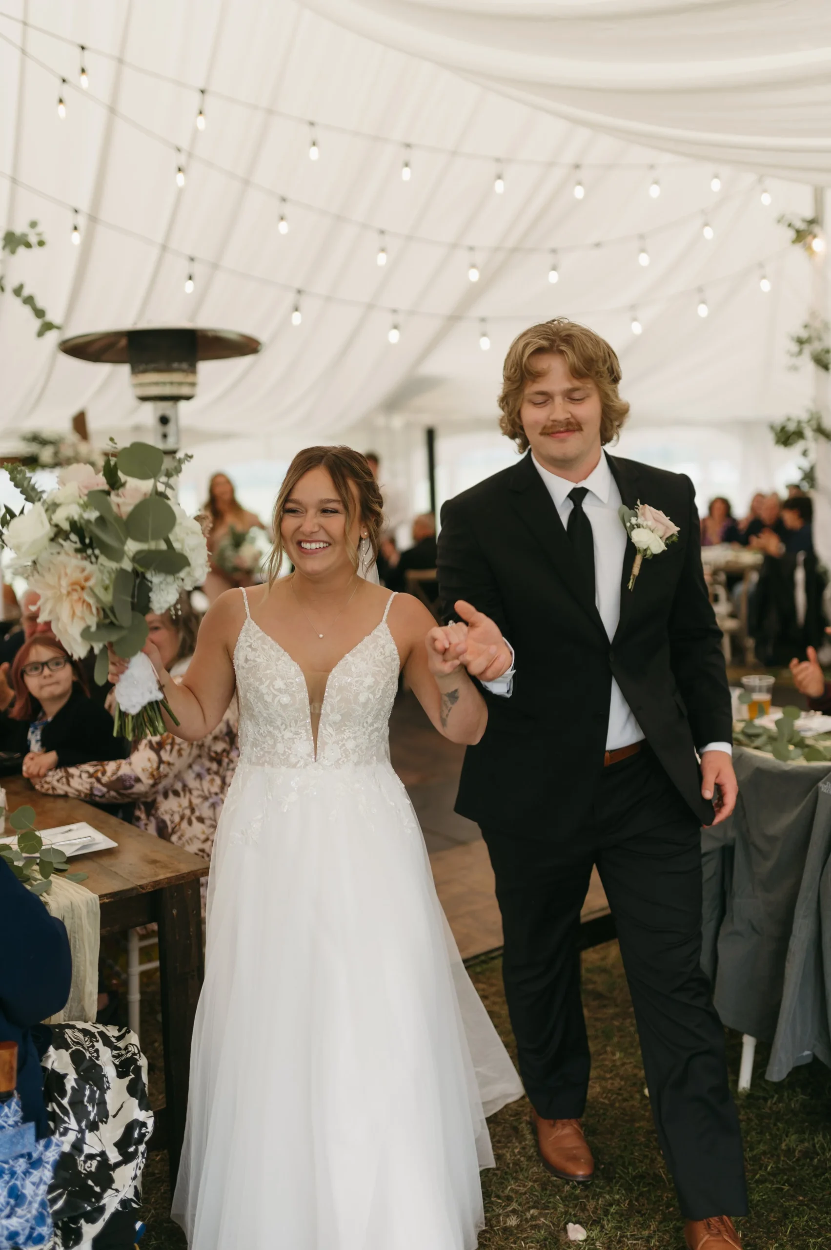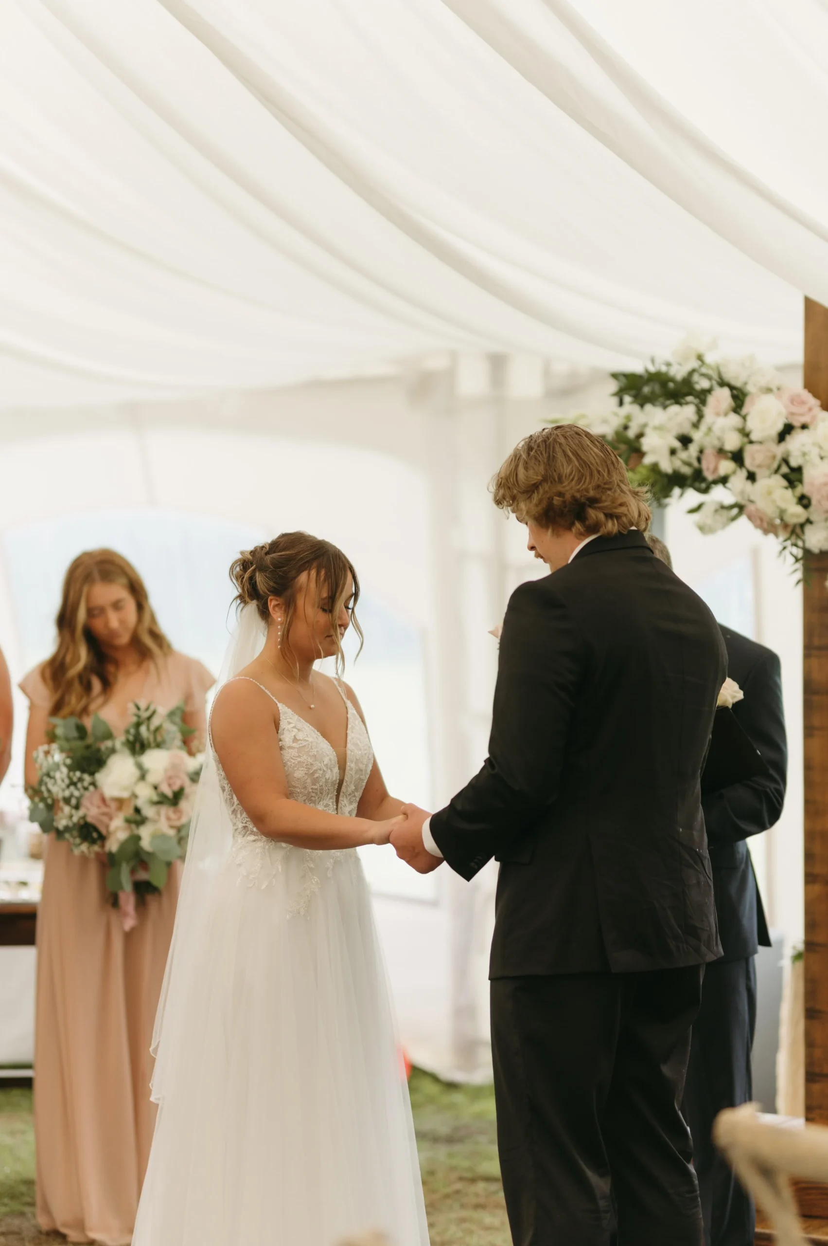 Delaney and Pasha’s wedding started off in a full-blown monsoon! There was torrential downpour and hurricane winds. Having wind or rain is one thing, but the combination of both was terrible! Nevertheless, we made the best of it by capturing photos in the stunning barn while we waited for the weather to let up a little bit. We kept watch on the radar and pushed things back 20 minutes here or there since the storm was supposed to subside. However, every time we thought the weather improved, we would go outside and it would get ten times worse! We ended up pivoting to photographing portraits in the greenhouses and documenting the ceremony in a tent. Right after the ceremony, the weather luckily cleared and we frolicked in the gorgeous fields. All in all, Delaney and Pasha’s rainy wedding day turned out beautiful.