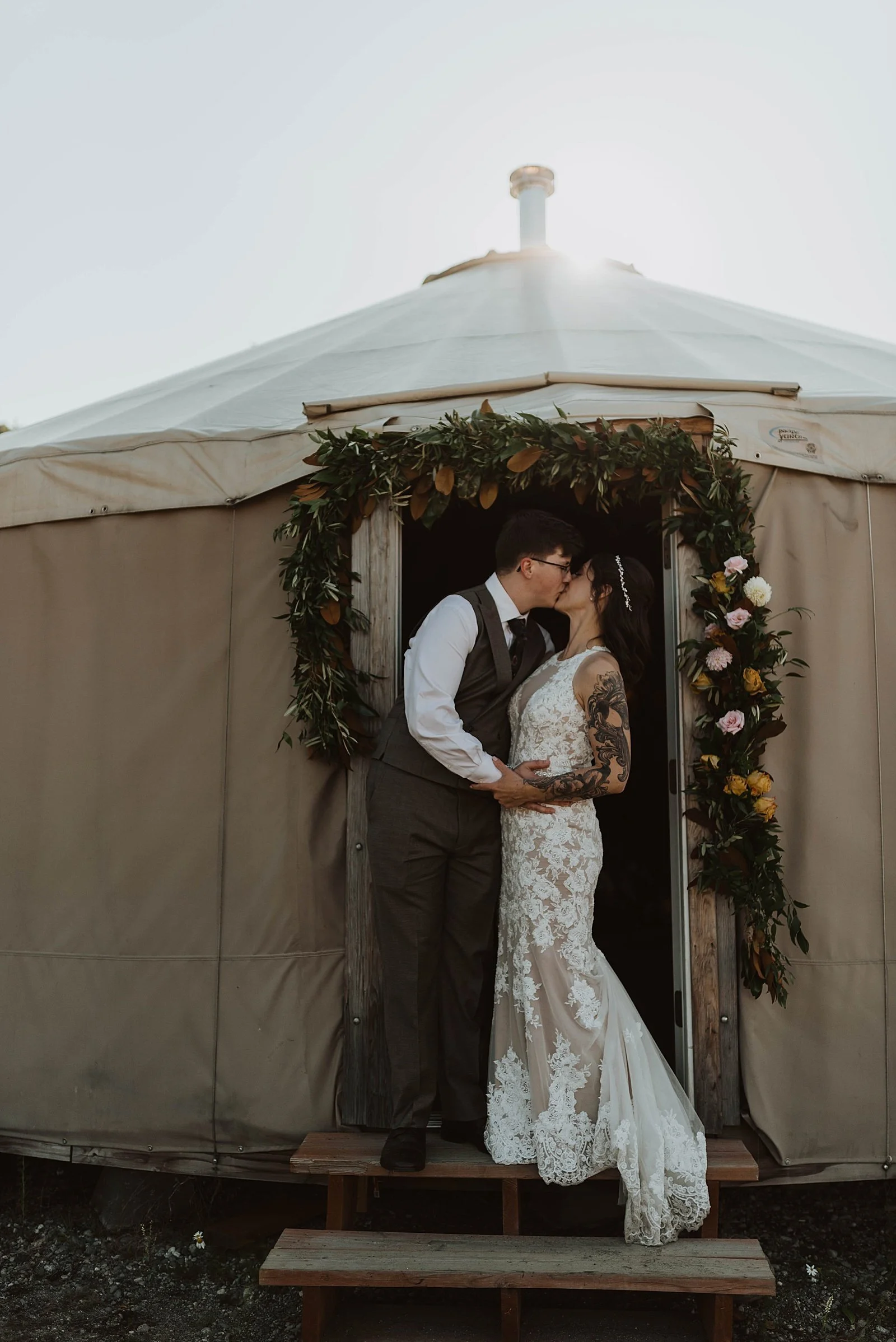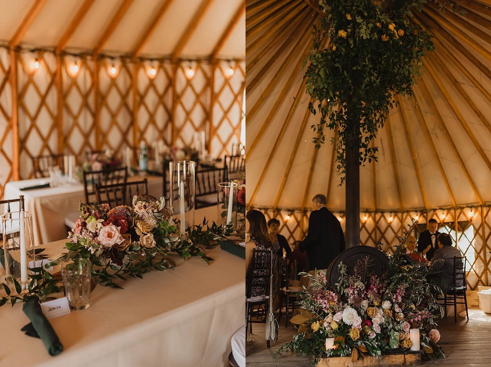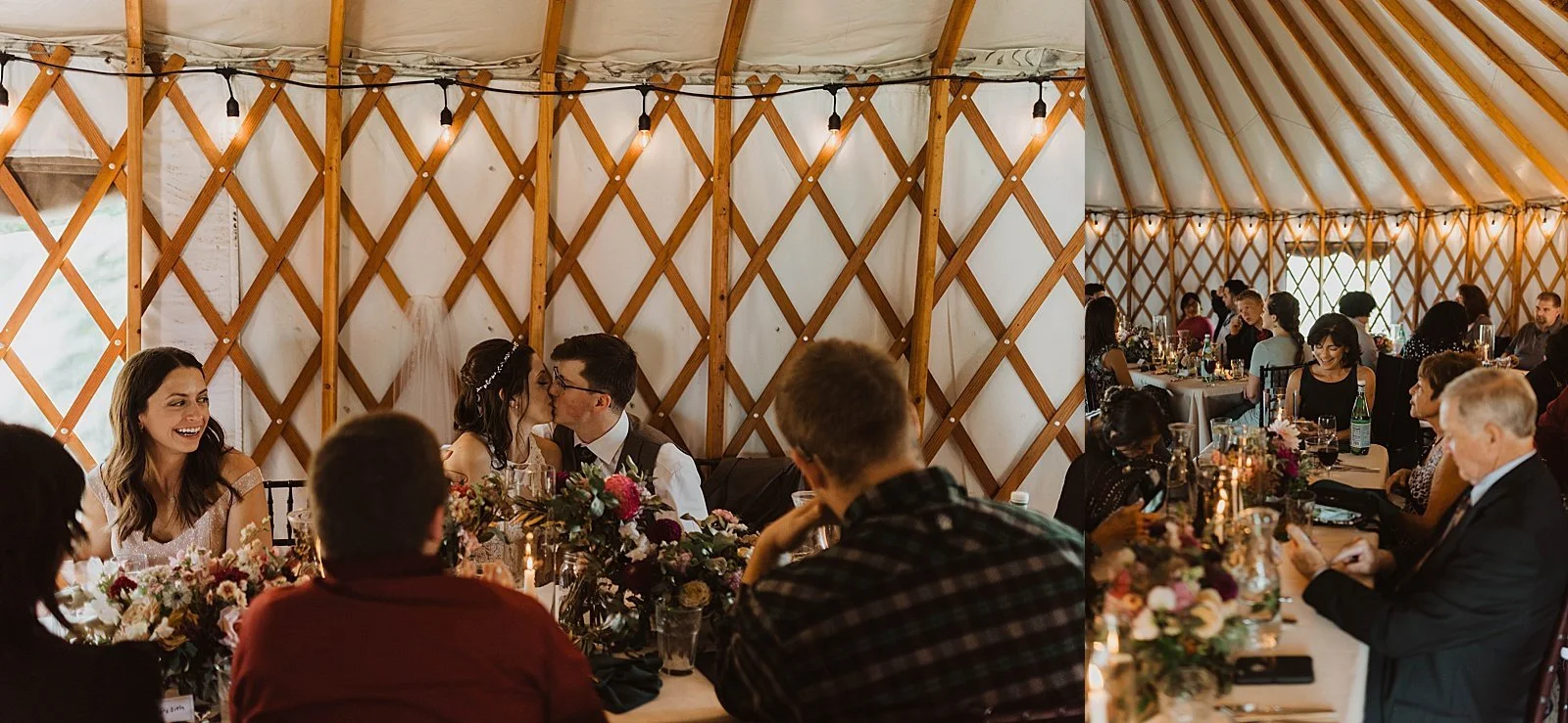The fun day didn’t end there. We took a helicopter back where they had an intimate reception set up IN A YURT. It was beautifully decorated for their wedding, and their guests enjoyed a warm meal together.